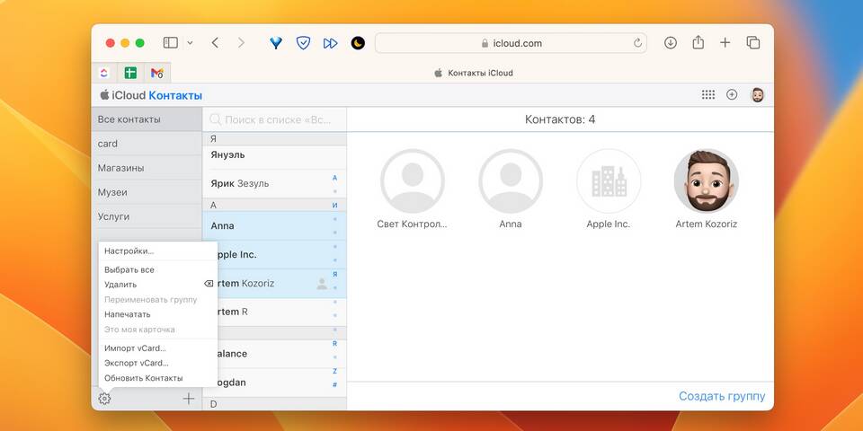 Контакты + | Простой интерфейс, поддержка группового экспорта |