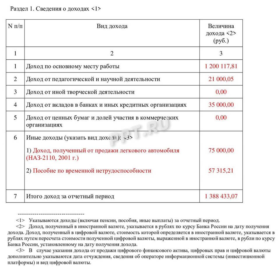 Образец заполнения раздела о доходах