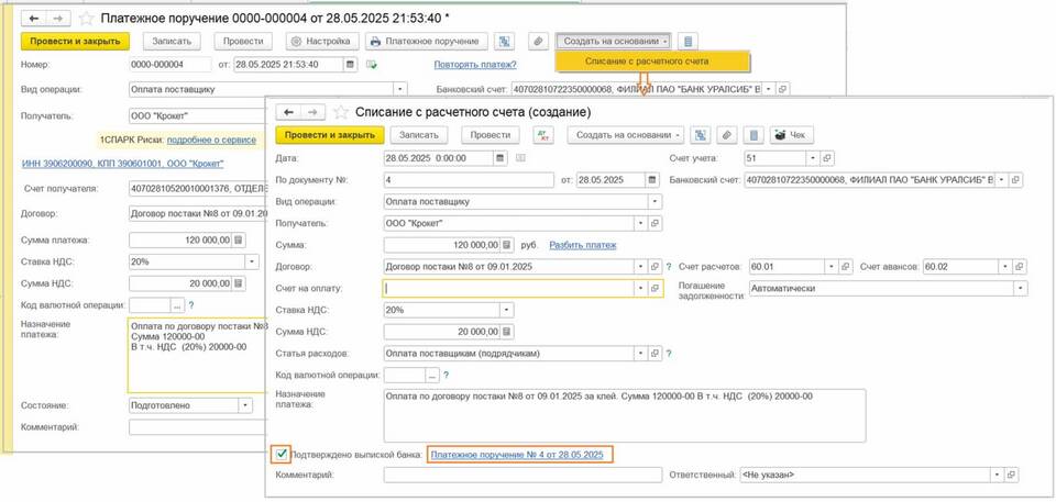 - Открыть раздел "Банк и касса"